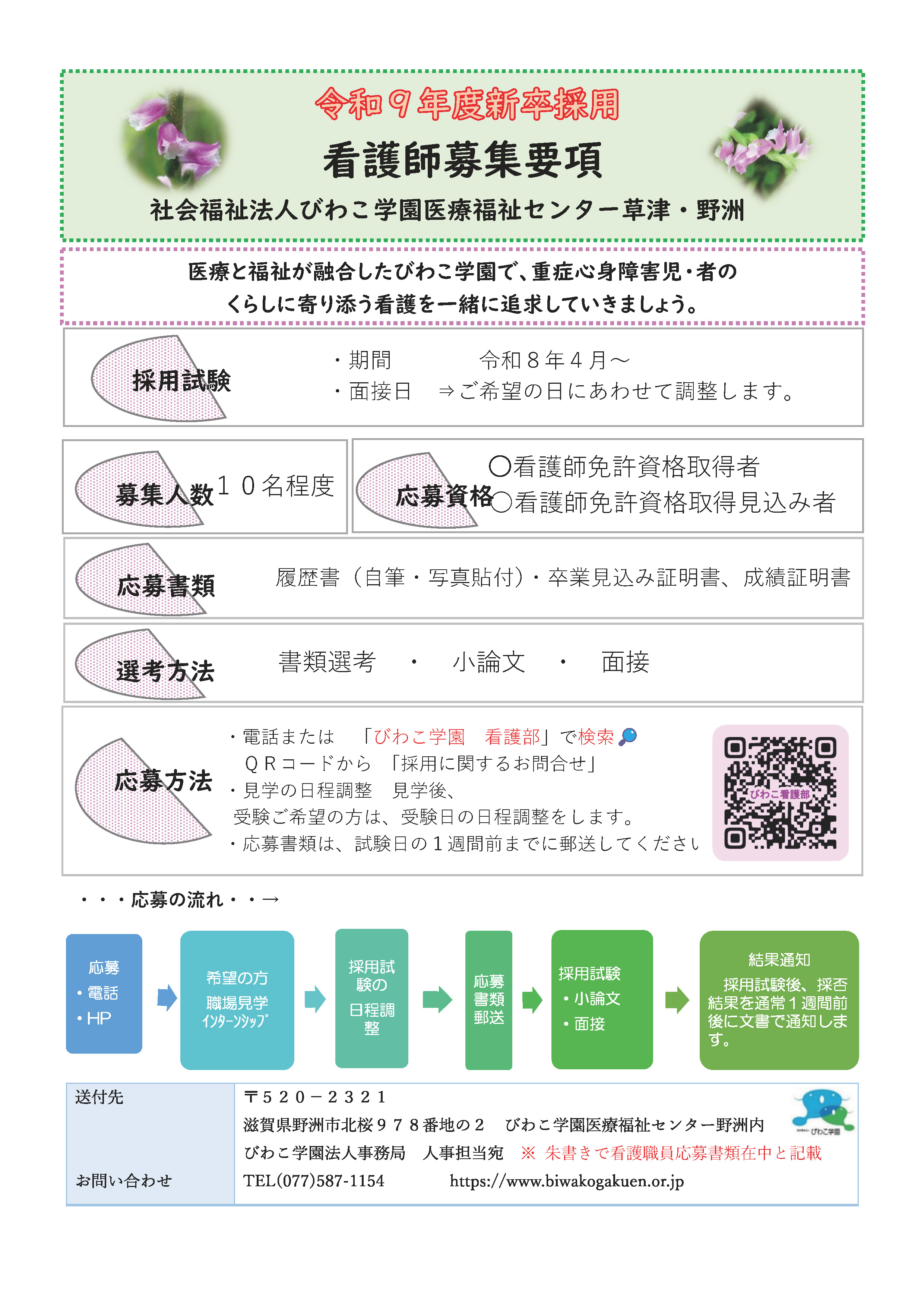 | 郵送先 | ・〒520-2321滋賀県野洲市北桜978番地の2 びわこ学園医療福祉センター野洲内 びわこ学園法人事務局 人事担当宛 ※ 朱書きで看護職員応募書類在中 |